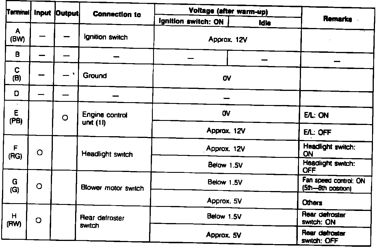 Fig. 90 E/L control unit terminal voltage specification chart.: