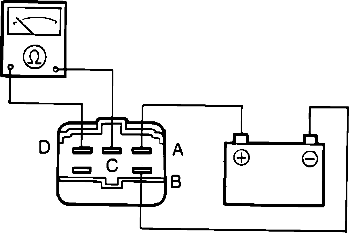 3. Using ohmmeter check for continuity. There should be no continuity between terminals C and D when voltage is not applied and there should be continuity when 12 volts is applied