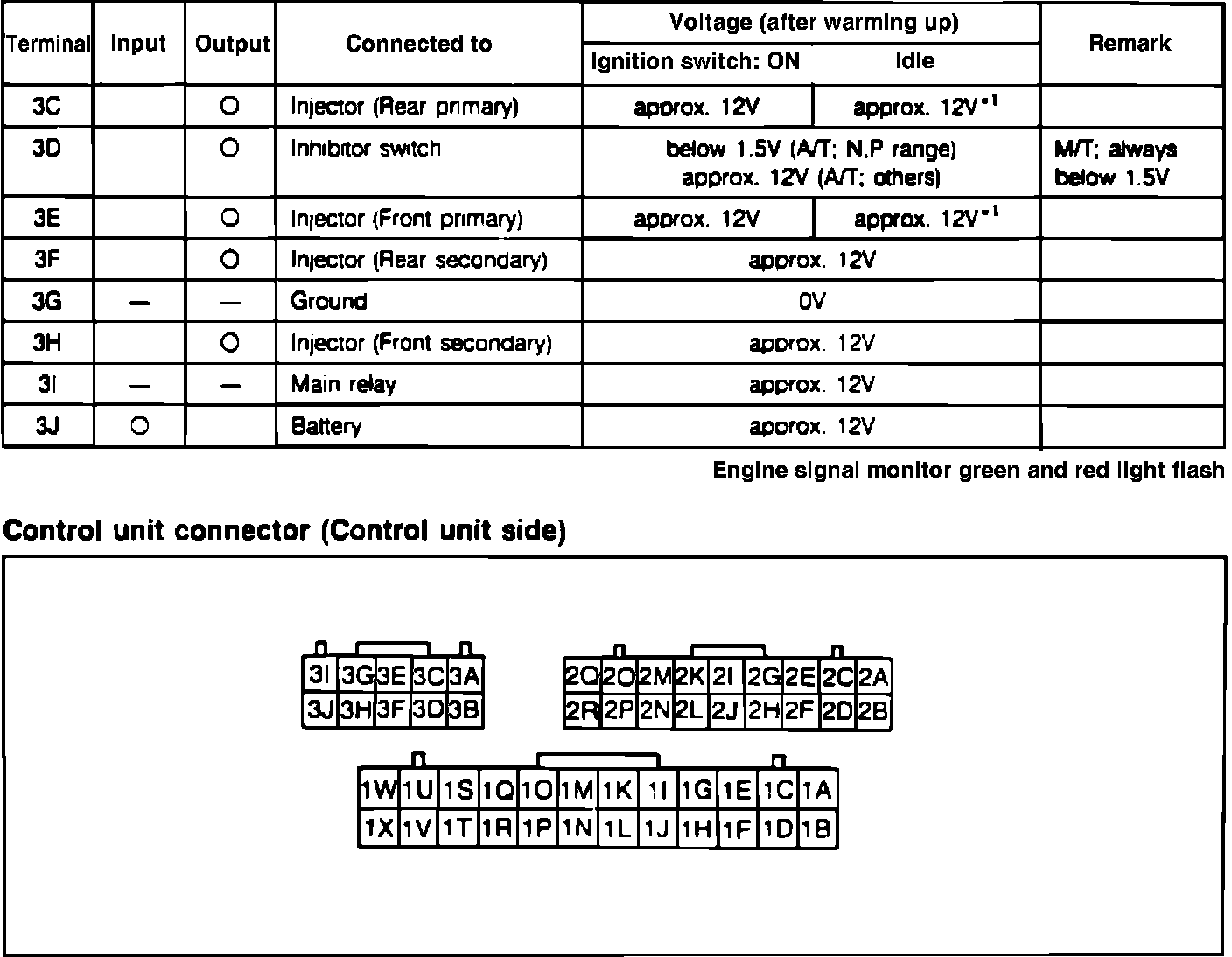 Fig. 70b Control unit voltage specifications chart. Exc. turbo: