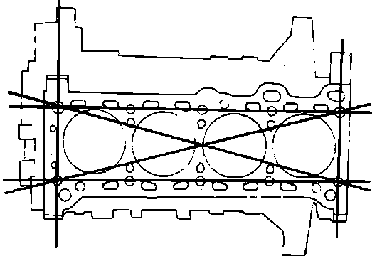 i. Measure cylinder block top surface distortion (warpage) in six directions as shown in Fig. 73. Distortion limit should be .006 inch.