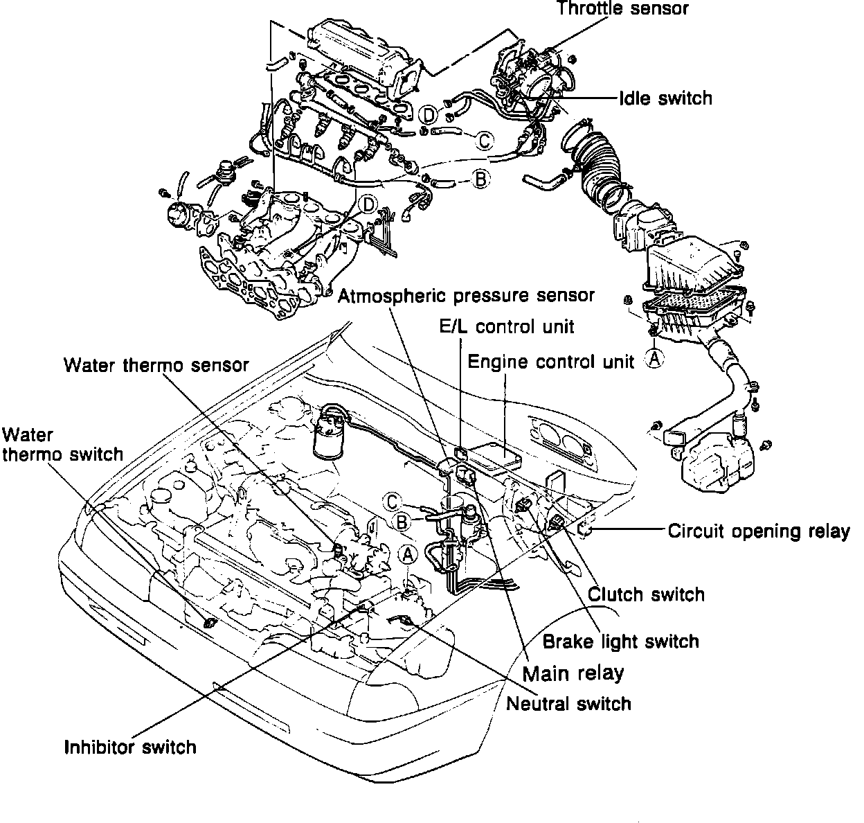 The computerized engine control system is the central control for electronic gasoline injection (EGI), electronic spark advance (ESA), idle speed control (ISC), and exhaust gas recirculation (EGR) function. The control system does this by monitoring vehicle operating conditions like brake light switch position, vehicle speed, electrical load, power steering pressure, air conditioning operation, exhaust oxygen content (oxygen sensor), coolant temperature, barometric pressure, intake air temperature, throttle position, intake air volume, and engine speed.