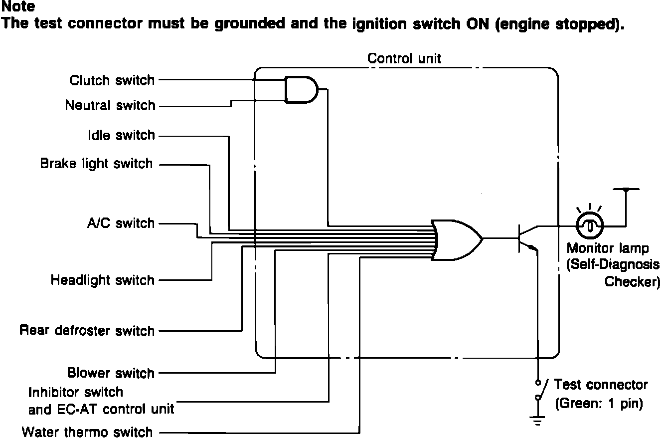 2. Connect the self diagnostic tester (SST Mazda Part# 49 H018 9A1) to the check connector (Green:6-pin) and the negative battery terminal.