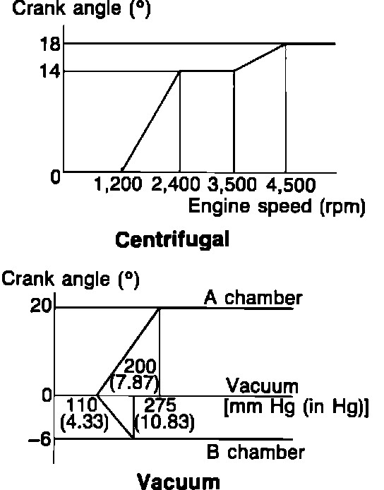 5. Alternately attach a hand vacuum pump to distributor vacuum unit chambers "A" and "B." Apply vacuum and note relationship between vacuum applied and degrees of advance or retard. Chamber "A" provides advance and chamber "B" provides retard. Compare to image chart.