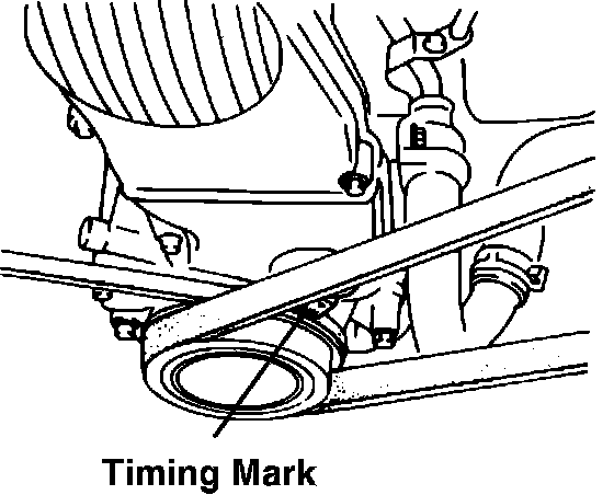7. Disconnect and plug hoses at distributor vacuum control unit. Check that timing mark (YELLOW) on crankshaft pulley and mark on timing belt cover are aligned.