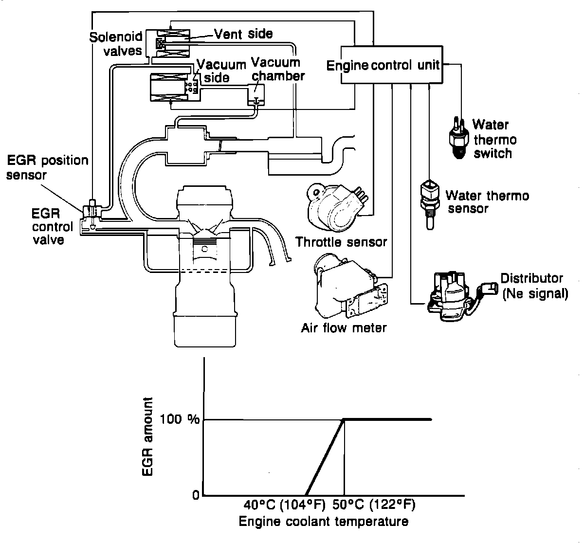 The engine control unit detects signals from input sensors and switches and controls the EGR solenoid valves (vent or vacuum side).