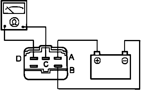 3. Check for continuity at relay terminals "C" and "D" with an ohmmeter. With 12 volts applied at terminals "A" and "B", there should be continuity between terminals "C" and "D". With the voltage removed, there should no longer be continuity between the two terminals.