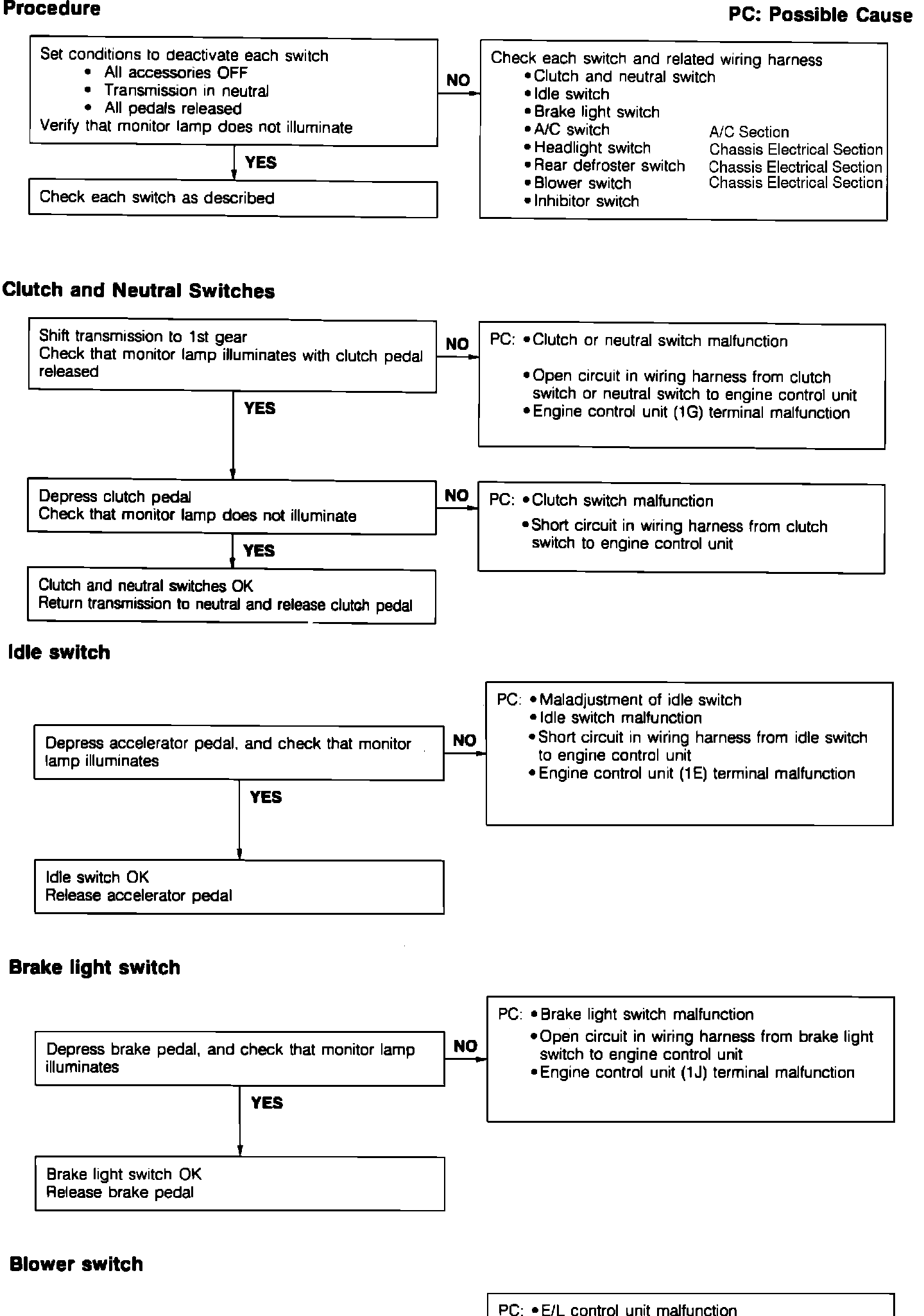 4. Turn the ignition switch on, then check that the monitor lamp illuminates when each switch is made to function according to the procedure below.