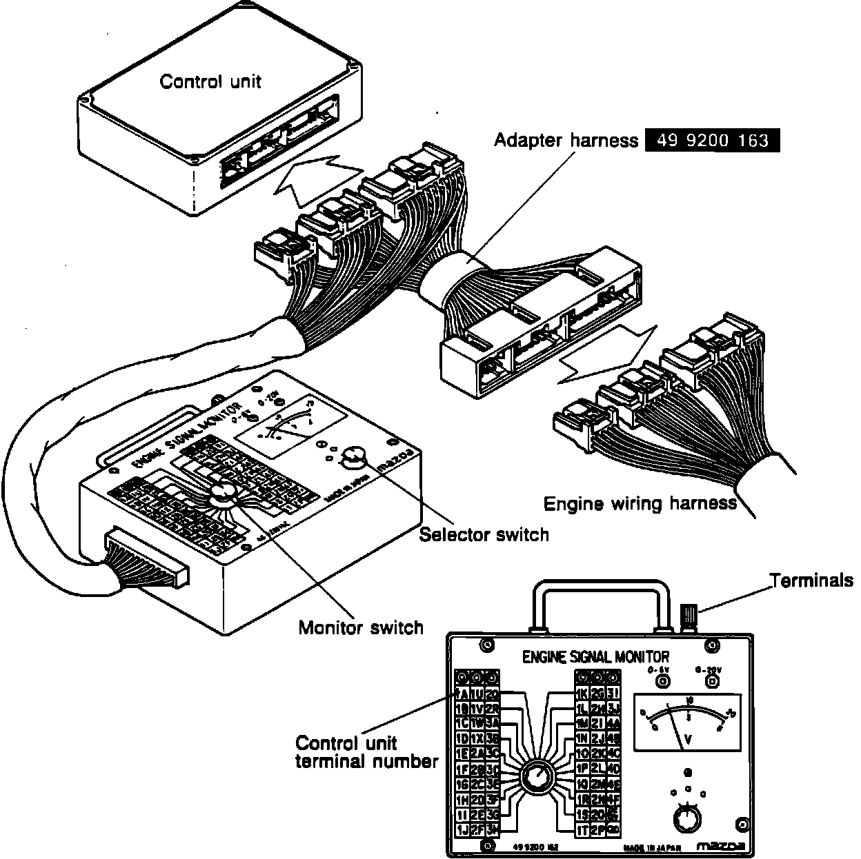 1. Connect the engine signal monitor between the control unit and the engine harness using the adapter (SST Mazda Part# 49 9200 163).