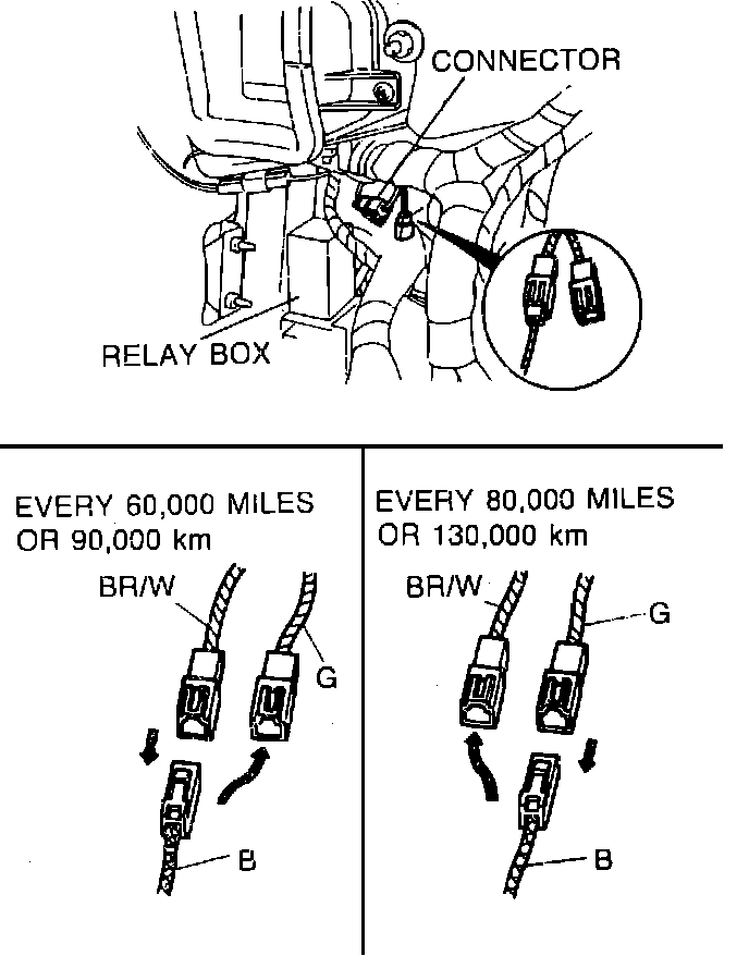 To reset the warning light after servicing the indicated components, locate the Brown/White, Black and the green wires located under the left side of the dash (taped to the wiring harness above the relay box). At 60,000 mile intervals, unplug the Black wire connector from the Brown/White connector and plug it into the Green wire connector. At 80,000 mile intervals, return the Black wire connector to the Brown/White wire connector.