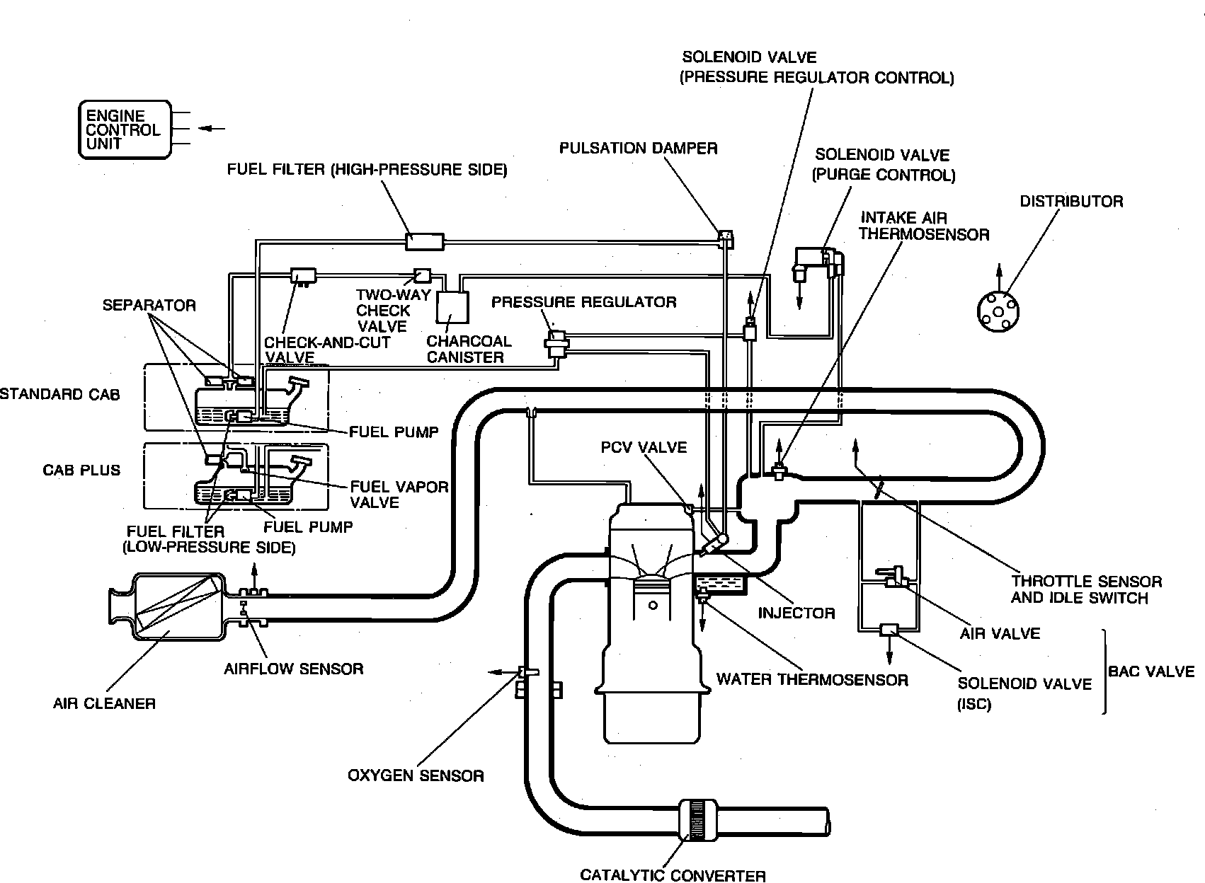 The ECU is a computer that judges air/fuel ratio as rich or lean according to a voltage signal generated by an oxygen sensor. Based on oxygen sensor and other input data, the ECU generates a controlling signal to the fuel injectors that regulates "ON" time. Because fuel pressure remains constant, the ECU controls air/fuel ratio adjustments by varying injector "ON" time.