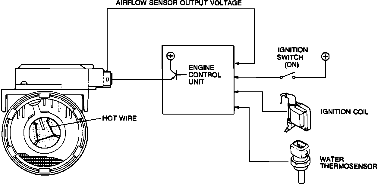 The computerized engine control related components of the burn-off control system are the airflow sensor, engine control unit (ECU), ignition coil, and the water thermosensor. The ECU receives inputs from the ignition coil and water thermosensor and determines when the hot wire in the airflow sensor needs cleaning. When this occurs, an 8-12 volt signal is sent to the green/orange wire (terminal 2K) of the airflow sensor connector 2-5 seconds after the ignition switch is turned off.