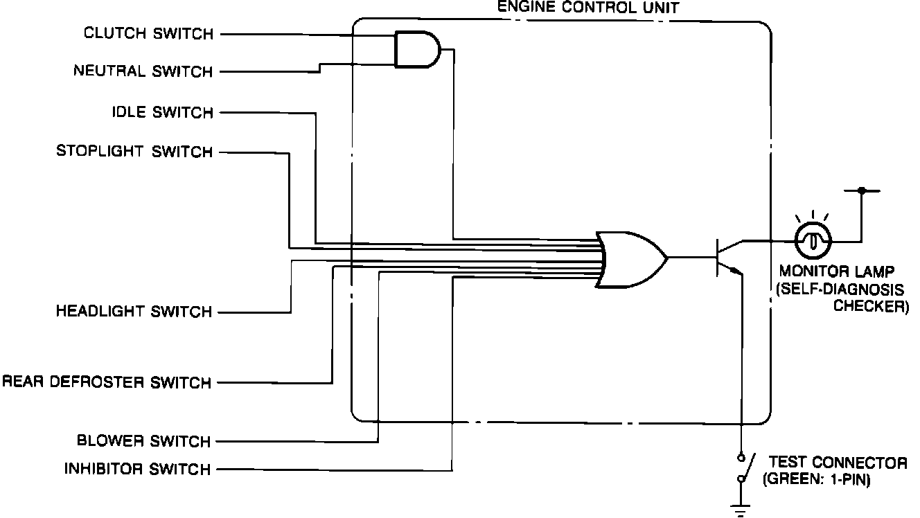 2. Connect the self diagnostic tester (SST Mazda Part# 49 H018 9A1) to the check connector (Green:6-pin) and the negative battery terminal.