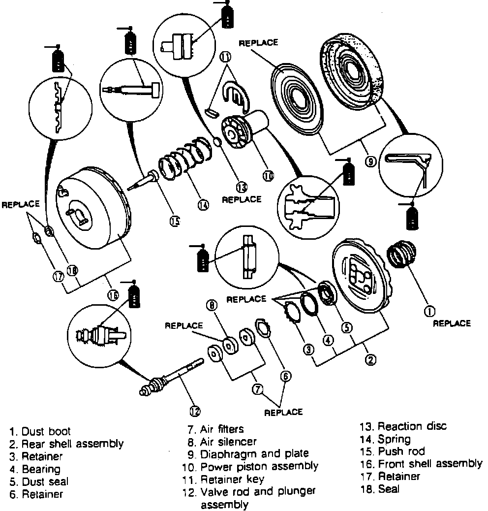 Only single diaphragm and some vacuum multiplier type boosters can be overhauled. To overhaul single diaphragm and vacuum multiplier type models, refer to Fig. 1. All items marked with oil can must be greased upon assembly.