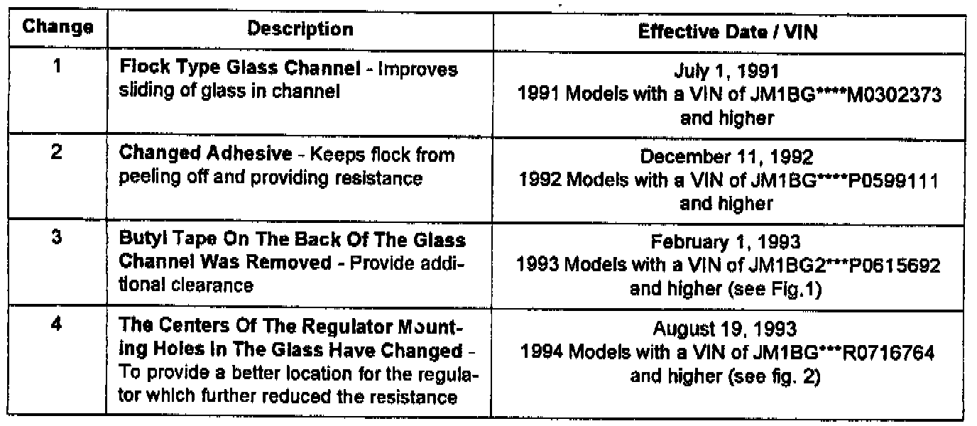 Do Not install the countermeasure window regulator to correct this problem. If the Parts Dept. has inventory of the countermeasure regulators, they should be used as service parts only.
