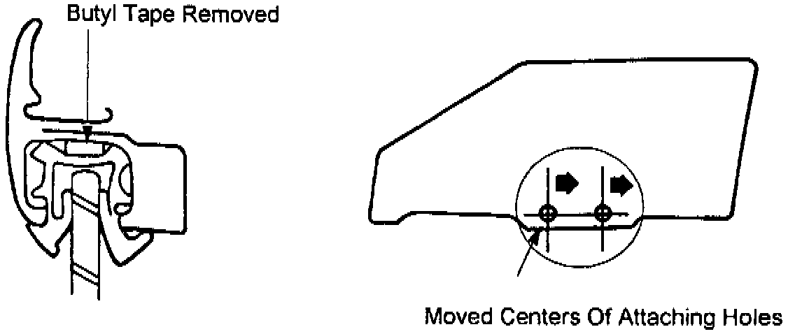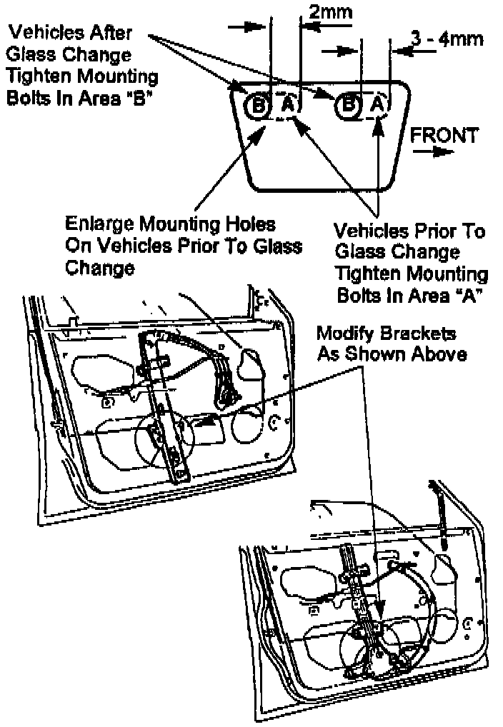 Vehicles Prior To Glass Change (Refer to Change # 4 in the table on page 1): If the countermeasure regulator is installed as a service part, mounting bolts must be tightened in the enlarged Area "A" of the mounting holes. Refer to Fig. 3.