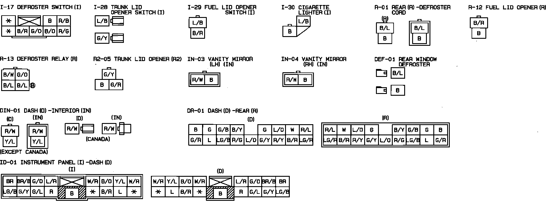 Vanity Mirror, Trunk & Lid Opener, Rear Window Defogger & Cigar Lighter. Connector Identification: