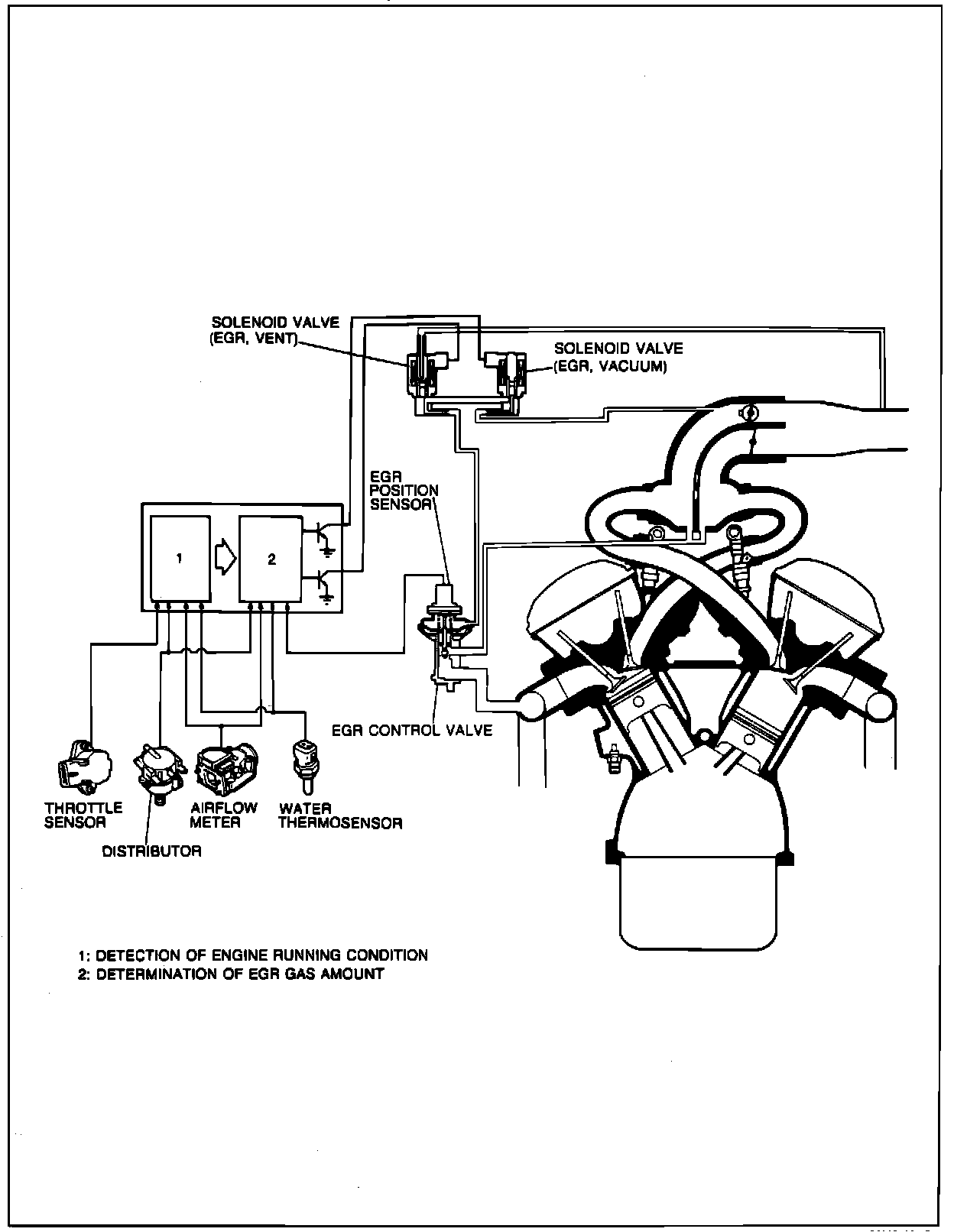 The EGR Position Sensor is incorporated in the EGR valve assembly. It is a variable resistor that detects EGR control valve lift. The ECU utilizes this information to optimize EGR system operation through its control of the EGR vent side and vacuum side solenoid valves. The signal is also included in ECU calculations for electronic spark timing control.