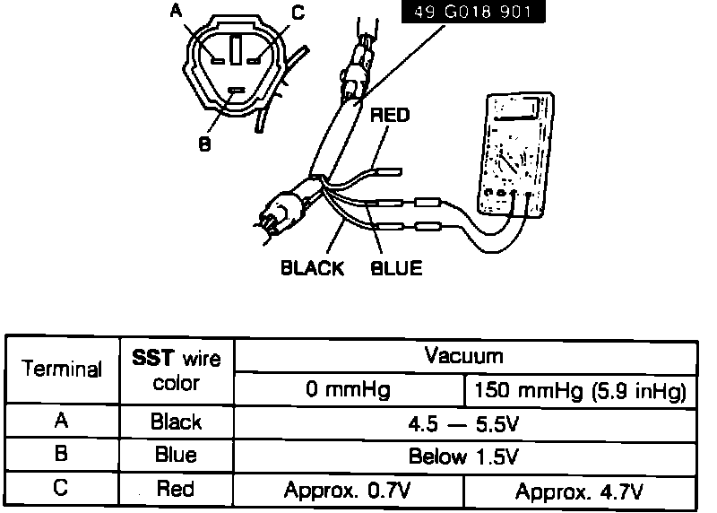2. Connect adapter (Mazda SST #49 G018 901 or equivalent) between sensor and vehicle wiring harness.