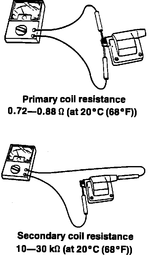 Check insulation resistance between primary terminal and coil case. It should read 10M ohms or more. Replace coil if it does not test as specified.