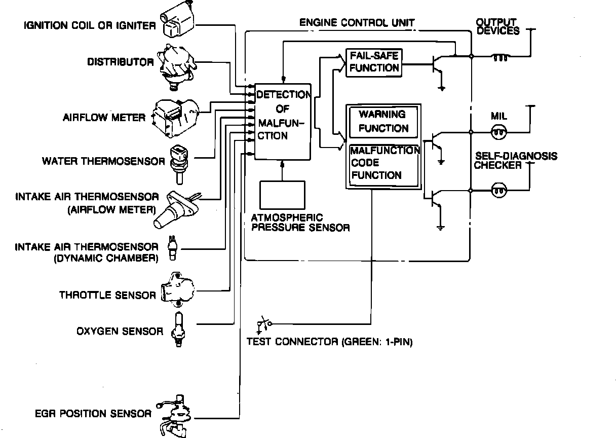 NOTE: The control unit constantly checks for malfunction of the input devices. But, it only checks for malfunction of output devices in a 3 second period after the ignition switch is turned ON with the test connector grounded.