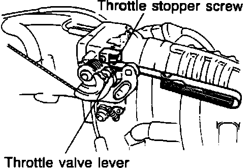 3. Check for continuity between terminals with a feeler gauge inserted between throttle stop screw and throttle valve lever. With a 0.5 mm (0.02 in) gauge inserted, there should be continuity between terminals. With a 0.7 mm (0.028 in) gauge inserted, there should be no continuity between terminals.