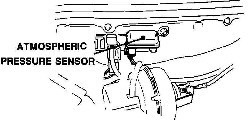 The Atmospheric Pressure Sensor, located on the firewall in the engine compartment, detects changes in barometric pressure related to changes in altitude from sea level. The sensor converts these changes to an electrical signal utilized by the ECU in its calculations of fuel injection quantity, idle speed and ignition timing control. The signal voltage ranges from 3.5 - 4.5V at sea level to 2.5 - 3.5V at high altitude (2000 meters, 6500 feet).