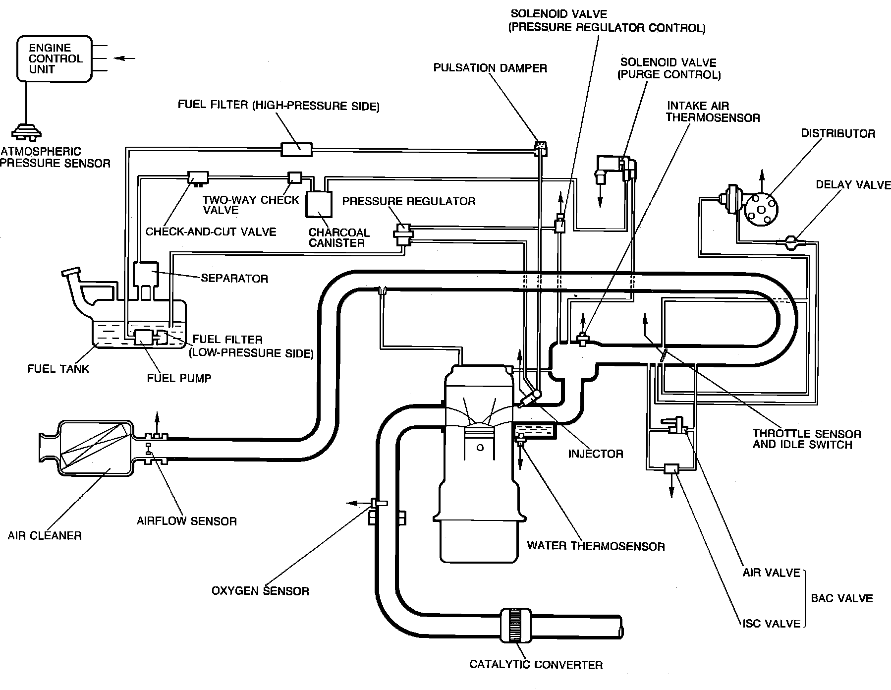 The ECU is a computer that judges air/fuel ratio as rich or lean according to a voltage signal generated by an oxygen sensor. Based on oxygen sensor and other input data, the ECU generates a controlling signal to the fuel injectors that regulates "ON" time. Because fuel pressure remains constant, the ECU controls air/fuel ratio adjustments by varying injector "ON" time.