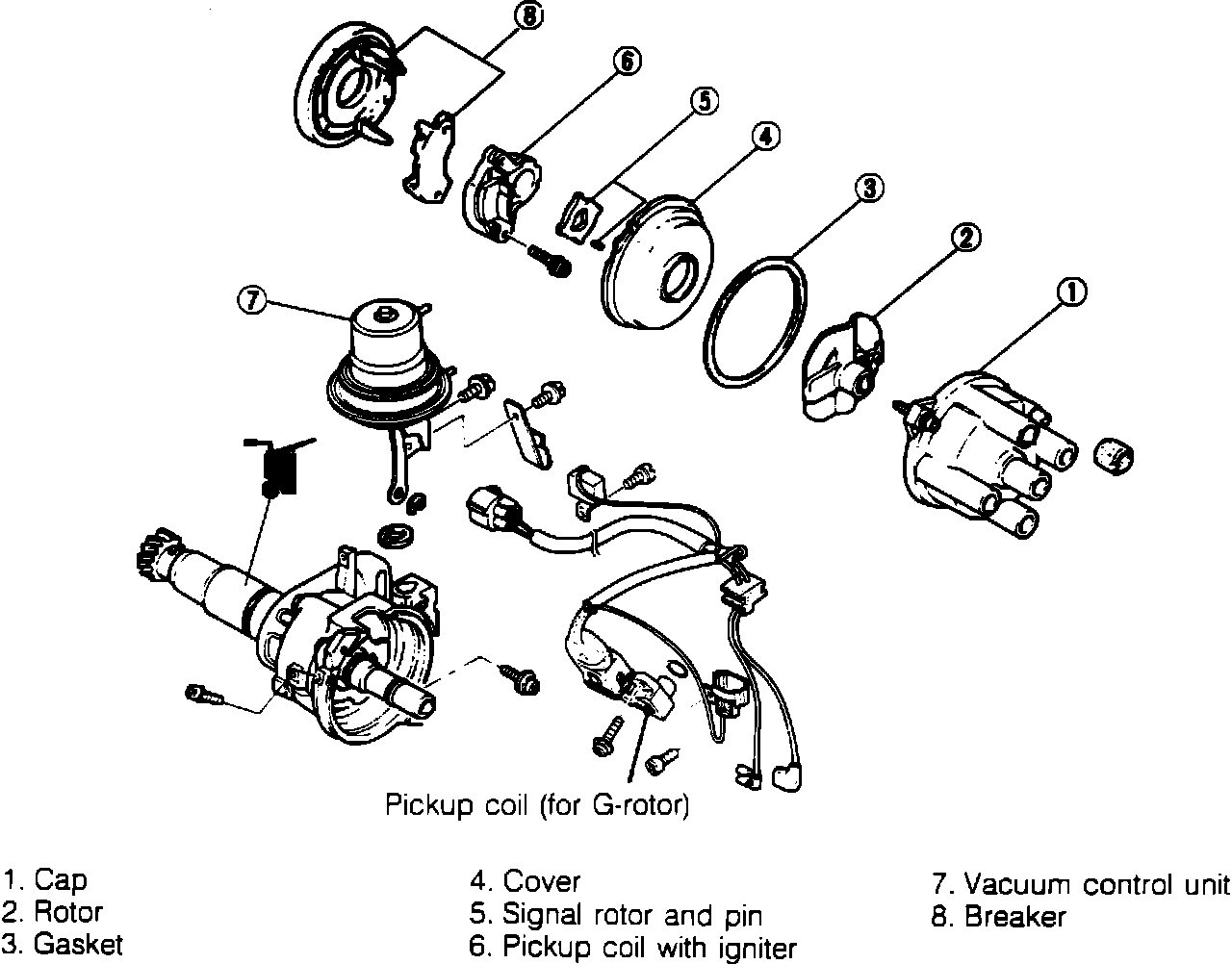 The Igniter, part of the pick-up coil in the distributor, is a switching device that activates the primary ignition coil circuit. The ECU transmits a primary current "OFF" signal to the igniter to trigger the coil. When the atmospheric pressure sensor detects high altitude (above 1000 meters, 3280 feet), the ECU advances timing approximately 6° to compensate for engine power loss. The timing is also automatically advanced approximately 6° at idle when the A/C is "ON."