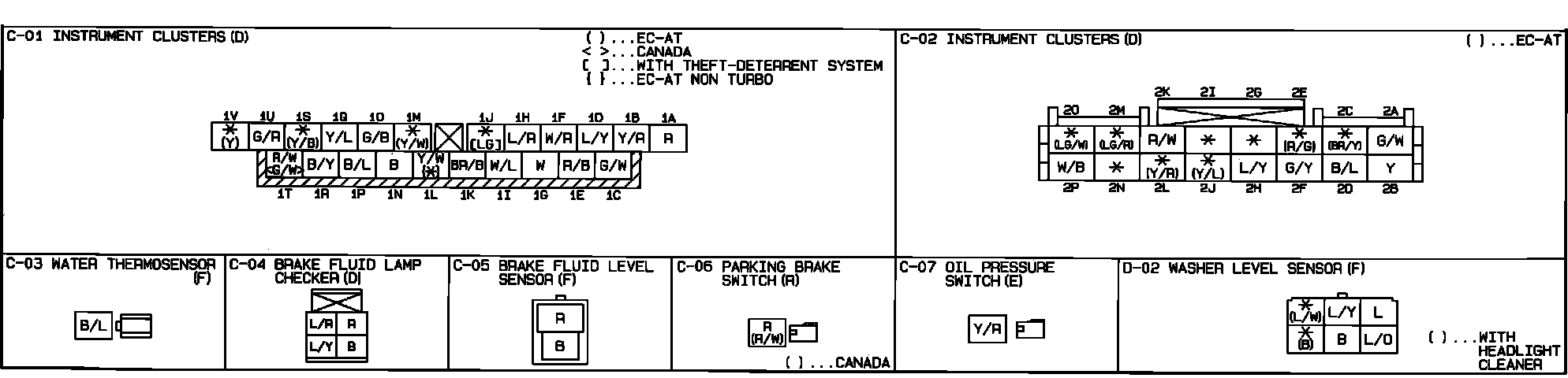 Instrument Clusters. Tachometer, Fuel And Temp. Gauge. Charge, Door, Brake, Rear, Washer, Oil And Security Indicator. Connector Identification: