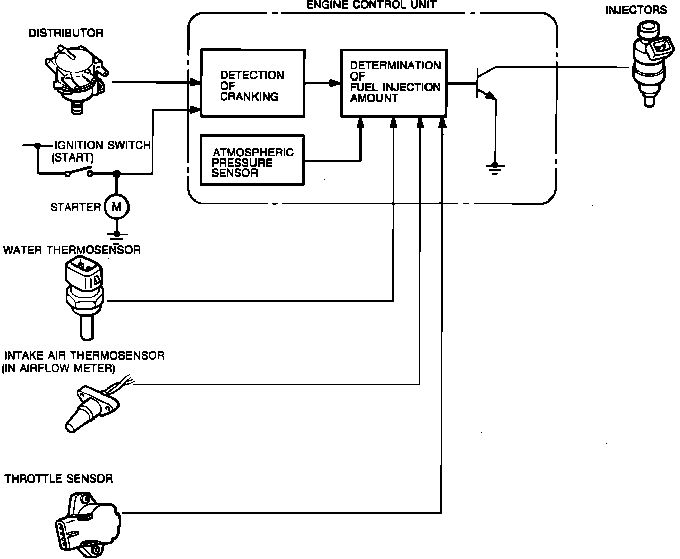 The ECU is a computer that judges air/fuel ratio as rich or lean according to a voltage signal generated by an oxygen sensor. Based on oxygen sensor and other input data, the ECU generates a controlling signal to the fuel injectors that regulates "ON" time. Because fuel pressure remains constant, the ECU controls air/fuel ratio adjustments by varying injector "ON" time.
