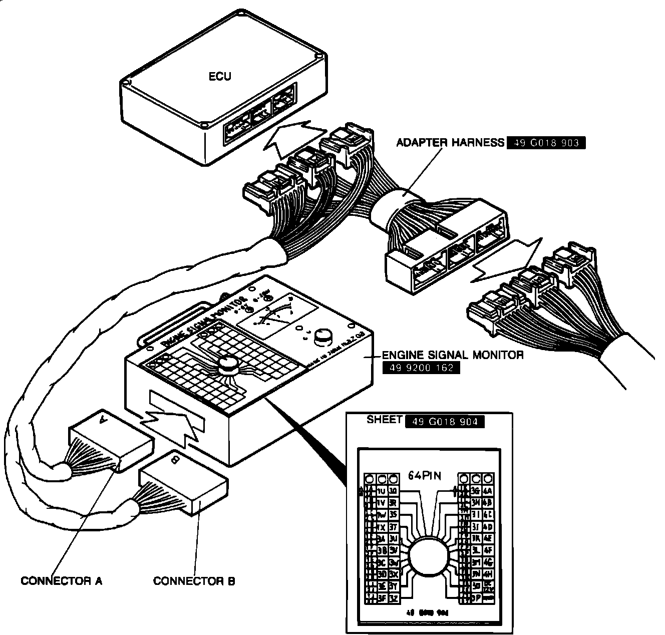 1. Connect signal monitor between ECU and wiring harness using correct adapter (#49 G018 903).