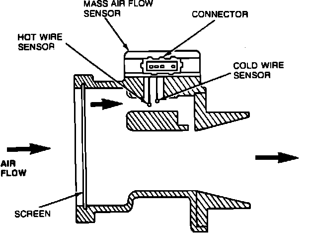 The sensor converts the amount of air taken into the engine to an electric signal by using the heat transfer phenomenon between incoming air and a heated resistor (wire). The ECU uses this information, together with input data from other sensors, to calculate fuel injector pulse ("ON" time) and thus regulate air/fuel ratio.