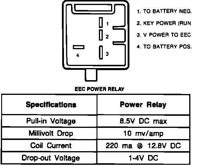 ^ The EEC (Electronic Engine Controls) Power Relay, located in the power distribution box on the right inner fender, is activated by the ignition switch to provide battery voltage to the ECA computer and other electronic components.