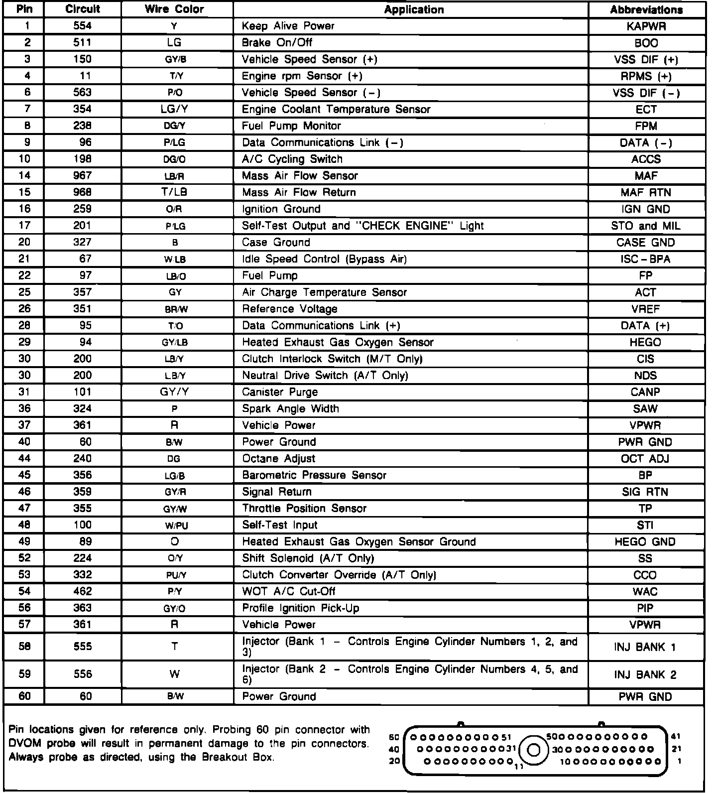 Always use a breakout box to make tests at ECA computer connector pins. Direct probing with a DVOM is likely to result in permanent damage to connectors.