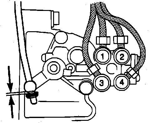 4. When installing metering oil connecting rod, check clearance as shown, Fig. 49. If clearance is not .039 inch (1mm), adjust with shims. On turbocharged models, be sure to connect oil tubes so that colors of tube ends match numbers as shown, Fig. 49: (1), blue; (2), white; (3), green; (4), yellow.