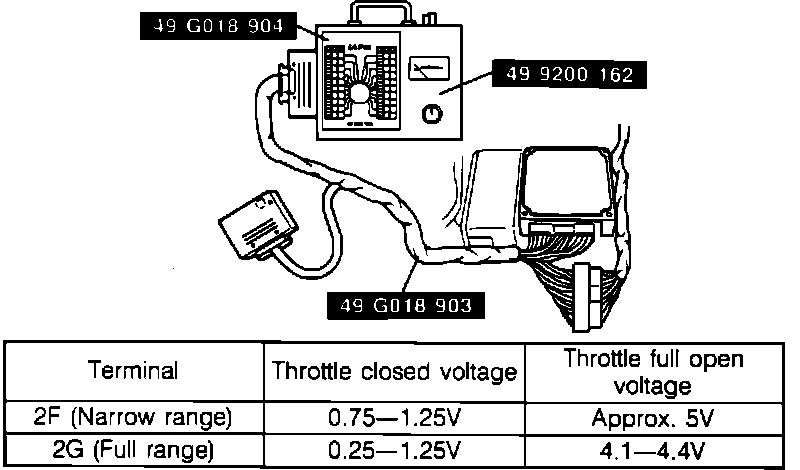 5. If not as specified, adjust throttle sensor. Refer to ADJUSTMENT PROCEDURES. If still not correct after adjustment, replace sensor.