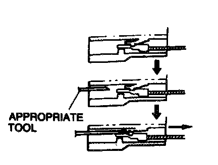 Insert a thin piece of metal from the terminal side of the connector, and then, with the terminal locking tab pressed down, pull the terminal out of the connector.