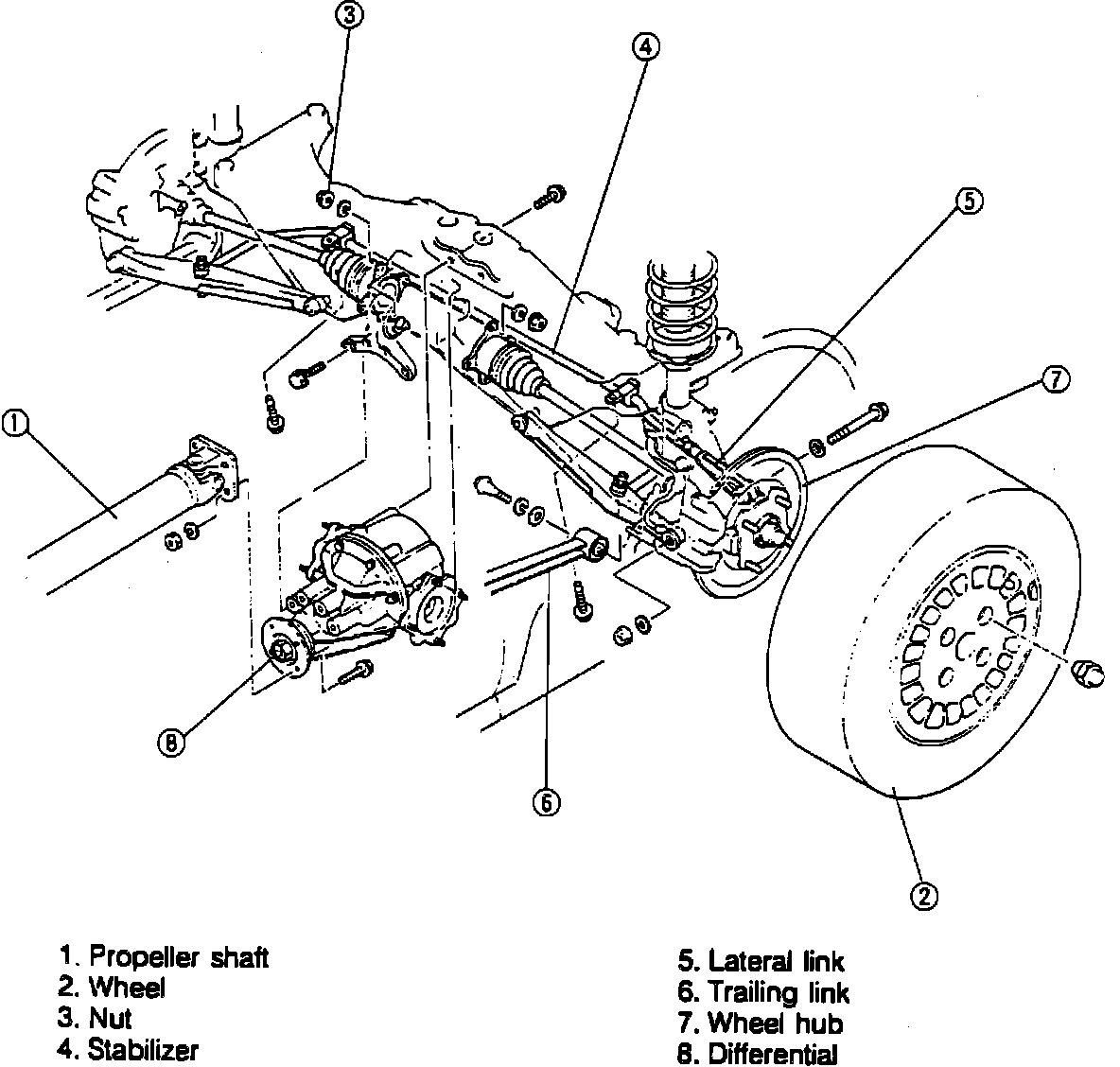 6. Remove lateral link. Be careful when disconnecting bolt and nut, as lateral link may be under tension.