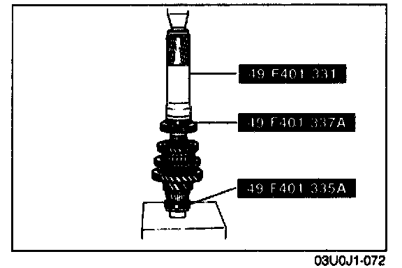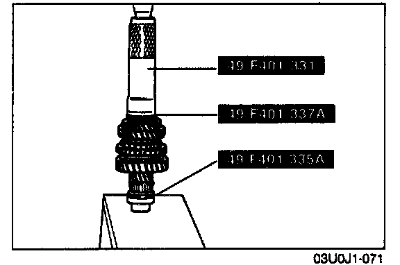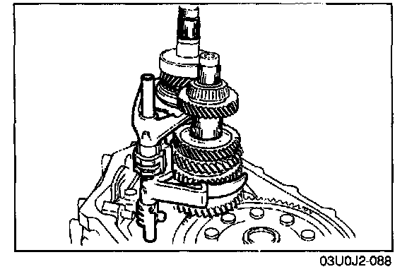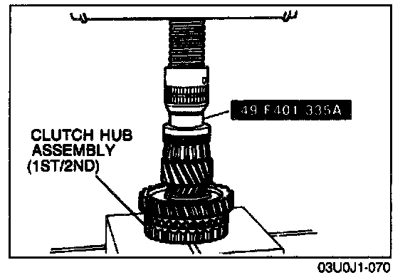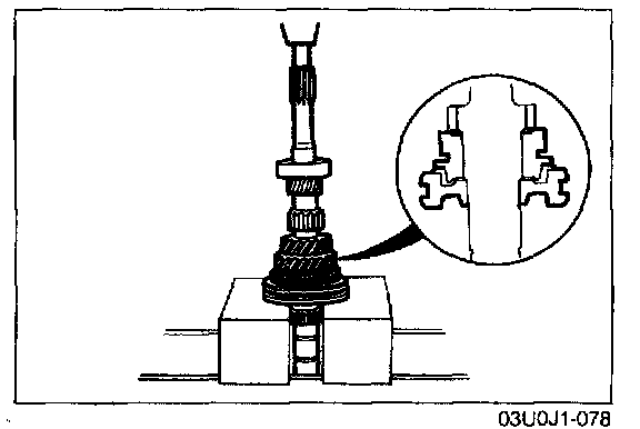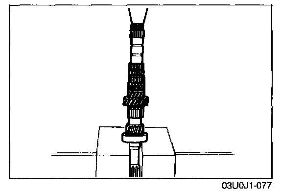 1. Turn the primary shaft over and install the 3rd gear, synchronizer ring (3rd), and clutch hub assembly (3rd/4th) with a press.