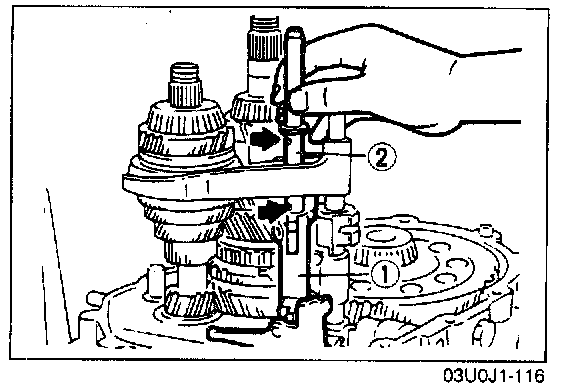 1. Install the clutch hub assembly (5th) and the 5th shift fork together.