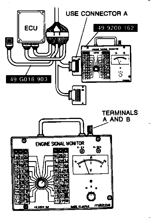 The Mazda Engine Signal Monitor (#49 9200 162) is utilized to check ECU terminal voltages. This tool inspects individual terminal voltages as selected with the monitor switch. A high impedance volt/ohm meter can also be used to check these voltages. Aftermarket test units are available that will read ECU terminal voltages when connected with proper adapters.