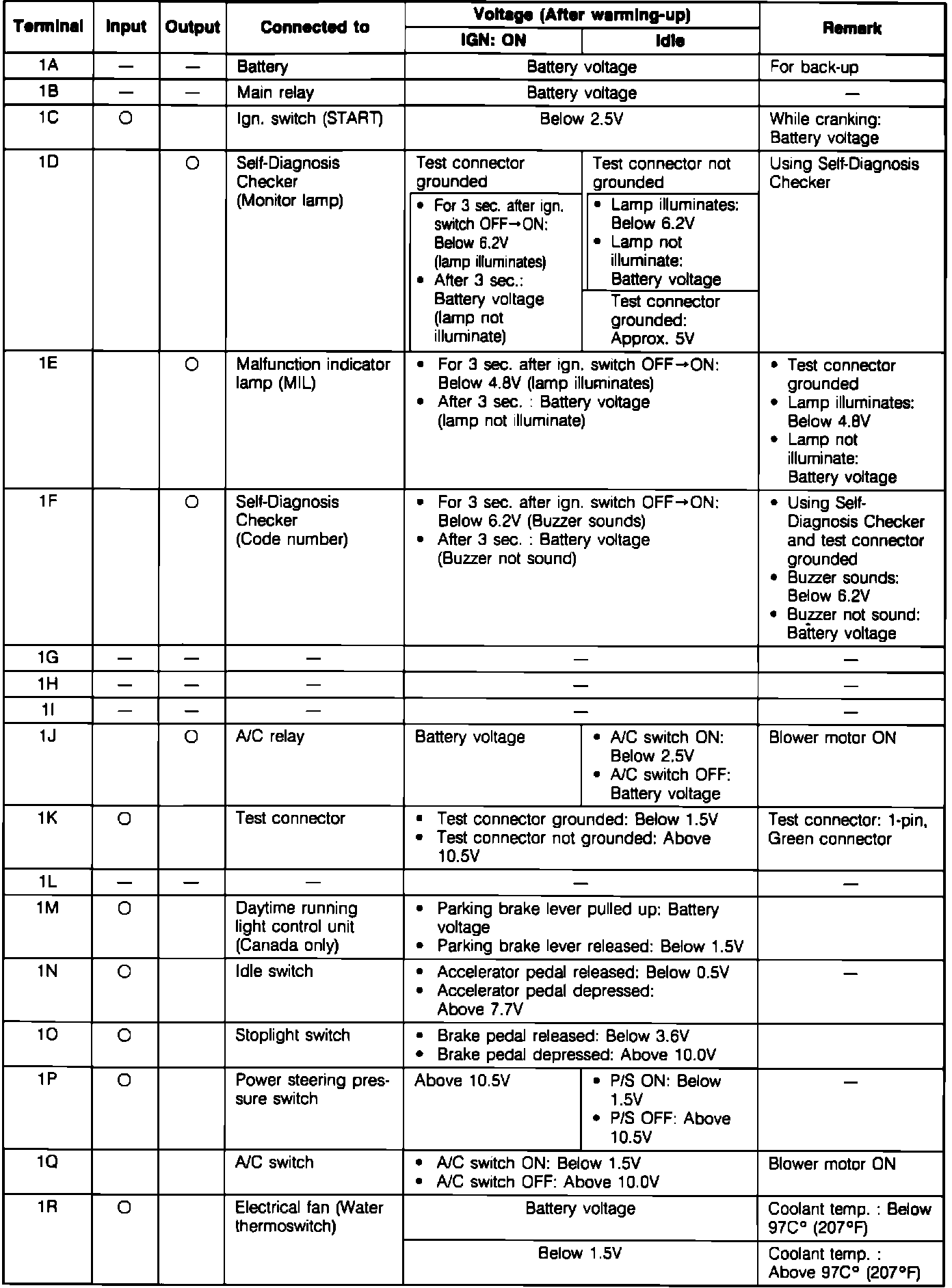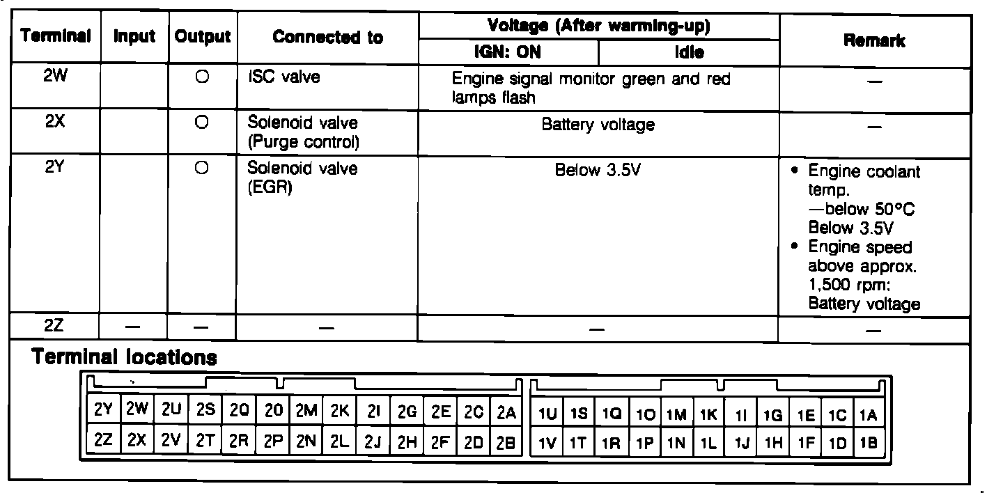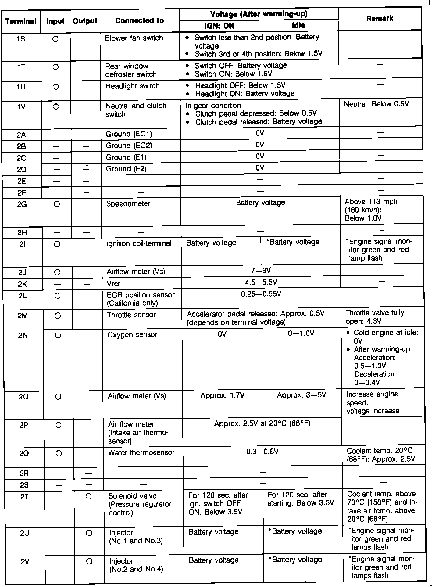 1. If factory test equipment is not available, use only digital volt/ohm meter with minimum 10Meg ohms internal impedance for testing ECU terminal voltages.