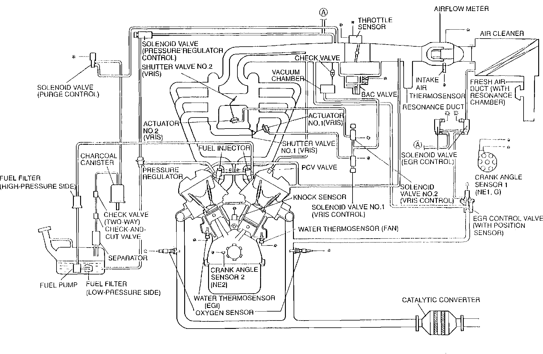 When the engine is running cold, the fuel injection system operates in what is known as "OPEN LOOP" mode. In this mode, the ECU determines the amount of fuel needed depending on the engine coolant temperature, throttle position sensor signal, and the amount of air flow as measured by the air flow meter. A specific pulse width is assigned for certain air flow rates at various temperatures and throttle openings. These are the "base" pulse width values stored in the computer memory, which provide a slightly rich air/fuel ratio for good driveability while the engine is cold and during warm-up.