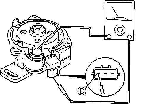 6. If there is no spark, check for battery voltage at the coil positive terminal (terminal "C" of 3-pin distributor connector) with ignition switch "ON."