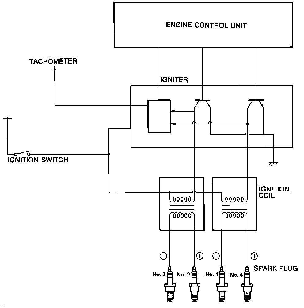 The crank angle sensor, mounted on rear of the cylinder head, detects crankshaft angle and provides a reference signal to the ECU. This information, together with input from various other sensors, permits the ECU to monitor engine operating conditions and compute optimum ignition timing at any given moment. Each coil fires two spark plugs simultaneously when the ECU operates the igniter to regulate current flow interruption in the coil primary windings.