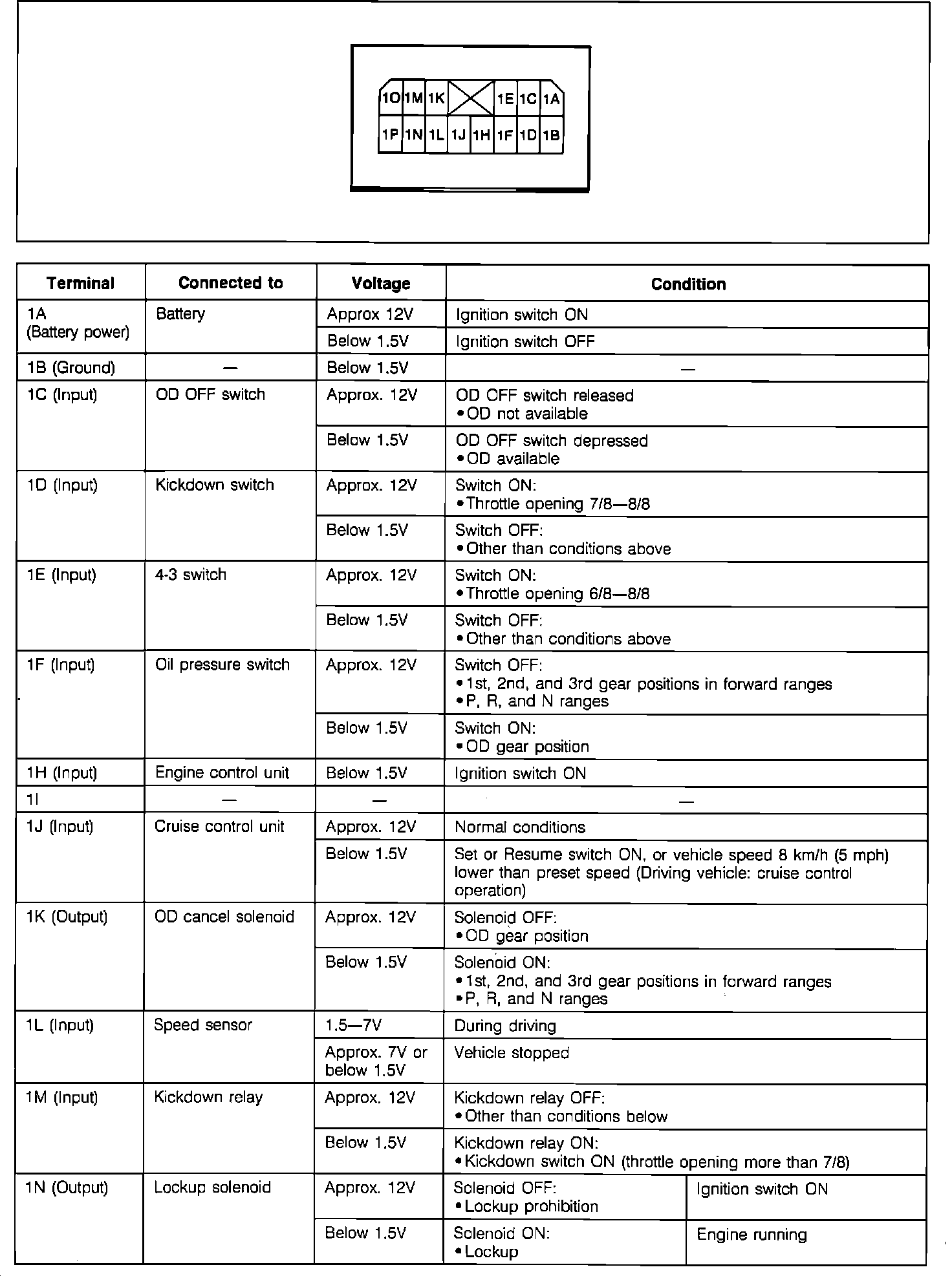1. Turn ignition switch "ON." Check 4/AT control unit terminal voltages, referring to Terminal Voltage Chart.