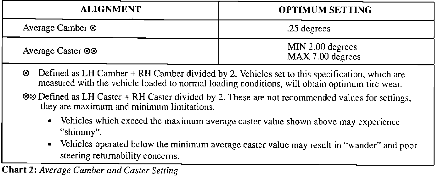 Chart 2 shows normal operating ranges for nominal caster and camber. If the caster and camber are within the range specified in the chart but a vehicle drift is still noticed, adjust the caster and camber side to side split to the values specified in Chart 1. If the vehicle is not within the specified caster range shown in Chart 2, the average caster should be set within the listed average caster range.