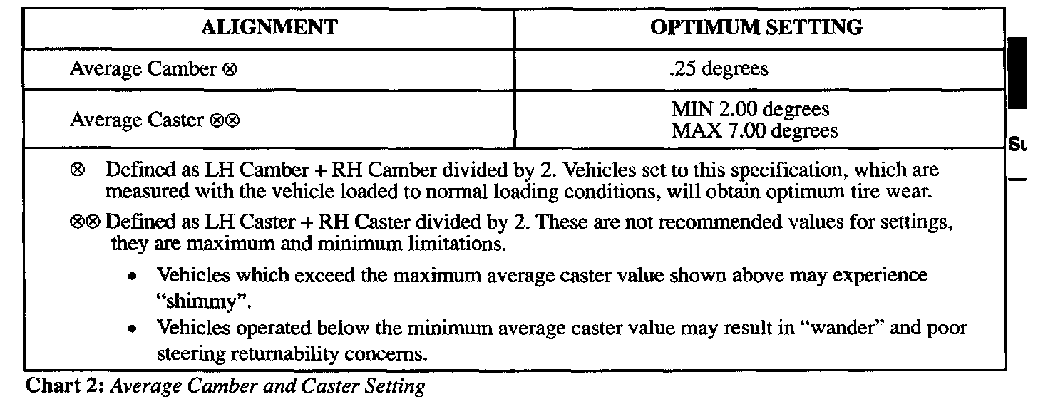 Chart 2 shows normal operating ranges for nominal caster and camber. if the caster and camber are within the range specified in the chart but a vehicle drift is still noticed, adjust the caster and camber side to side split to the values specified in Chart 1. if the vehicle is not within the specified caster range shown in Chart 2, the average caster should be set within the listed average caster range.