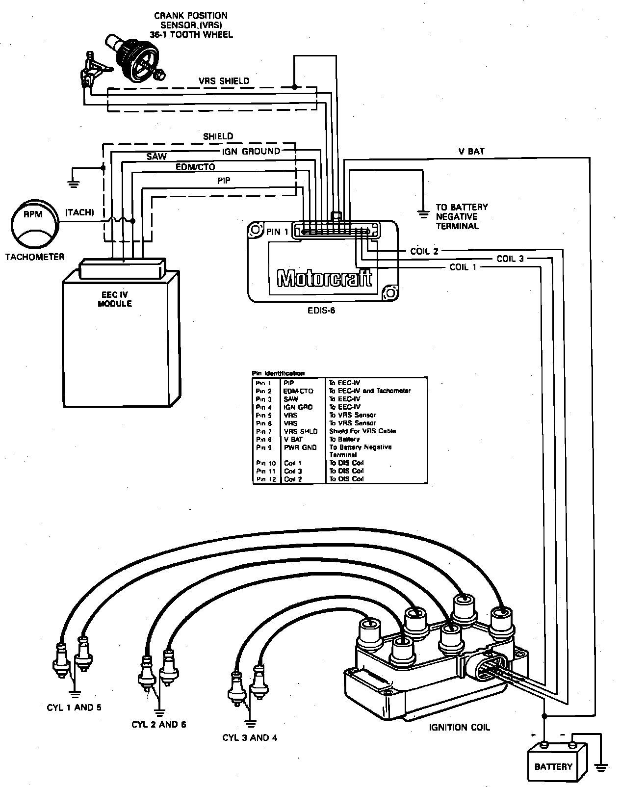 The Electronic Distributorless Ignition System (EDIS), consists of a Variable Reluctance Sensor (VRS), an EDIS Module, an EEC IV processor and one 6-tower Coil Pack. This system operates by sending crankshaft position information from the VRS to the EDIS module. The module generates a PIP signal and sends it to the EEC IV processor. The processor responds with a Spark Angle Word (SAW) signal containing advance or retard timing information back to the EDIS module. The module processes VRS and SAW signals and decides which coils to fire. In addition, the module generates an Electronic Diagnostic Monitor (EDM) signal to processor which is used to indicate a failure mode and also provide a tach output signal.