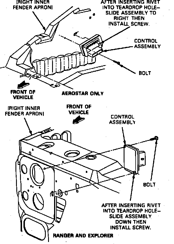 4. Remove module mounting bolt and remove module. On Ranger slide assembly up; on Aerostar slide toward front of vehicle, to release module from tear-drop hole in sheet metal.